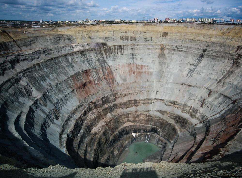 Pictured above you can see the Mirny diamond mine in Siberia. The mine is over 1,2 km wide – large enough to be seen from space.