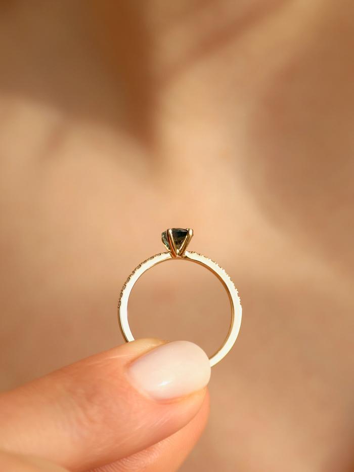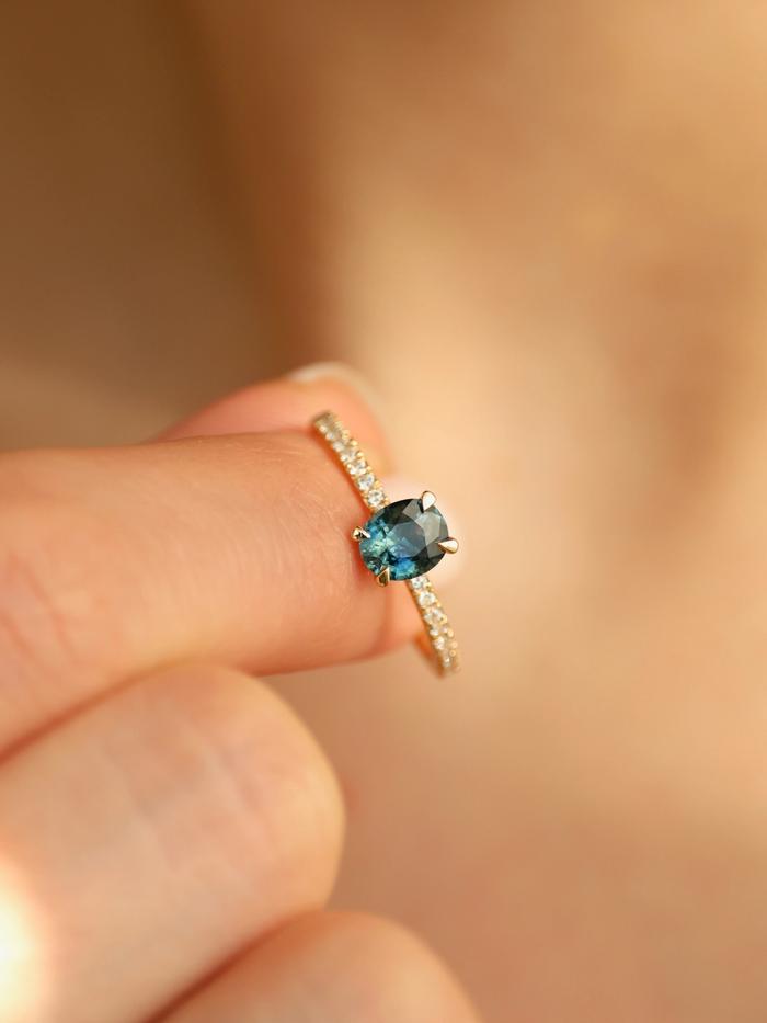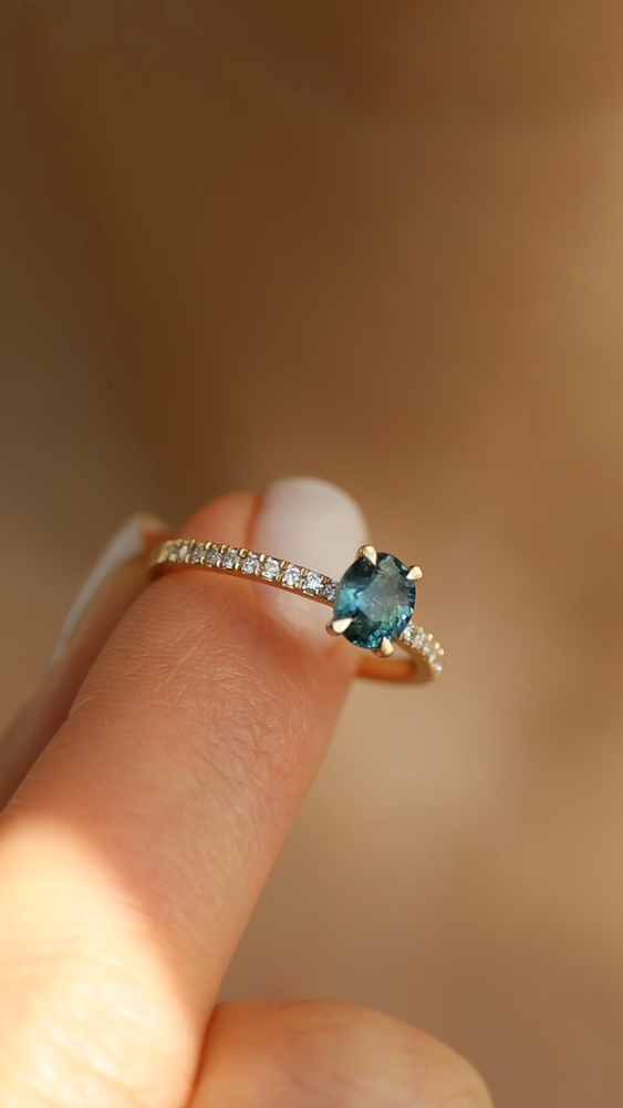 In a moment between sea and sky, Teal Whisper Sapphire & Pavé emerges — a ring of rare balance and refined power. Its centre glows with a quiet intensity, like deep waters catching the last light before dusk.