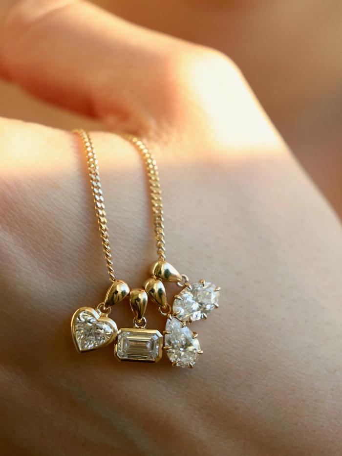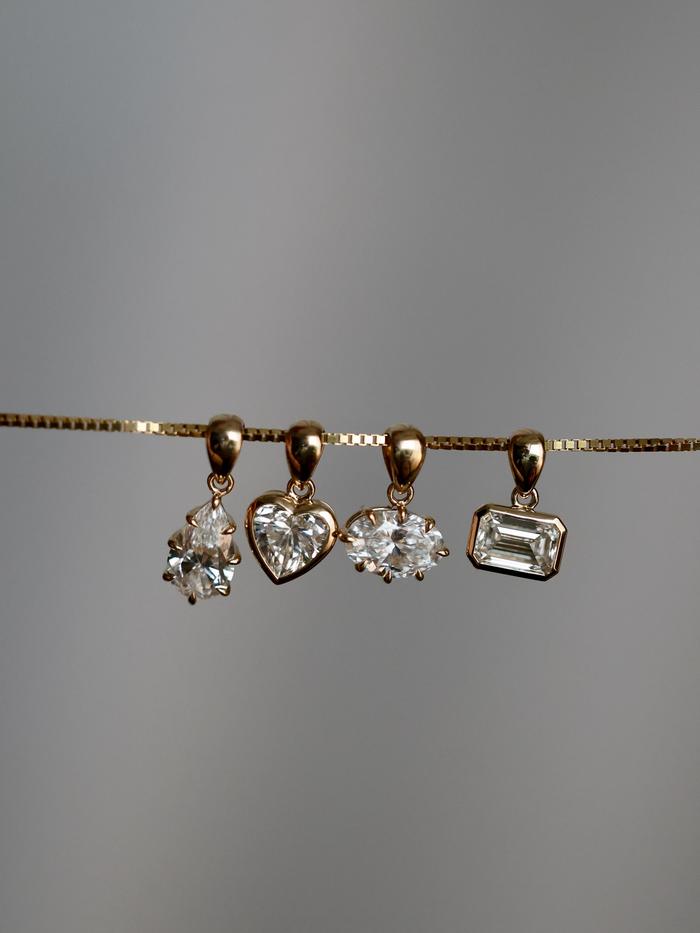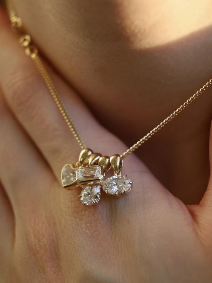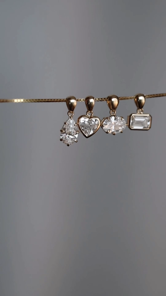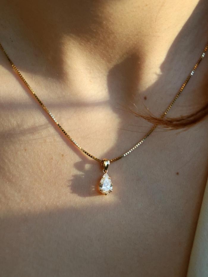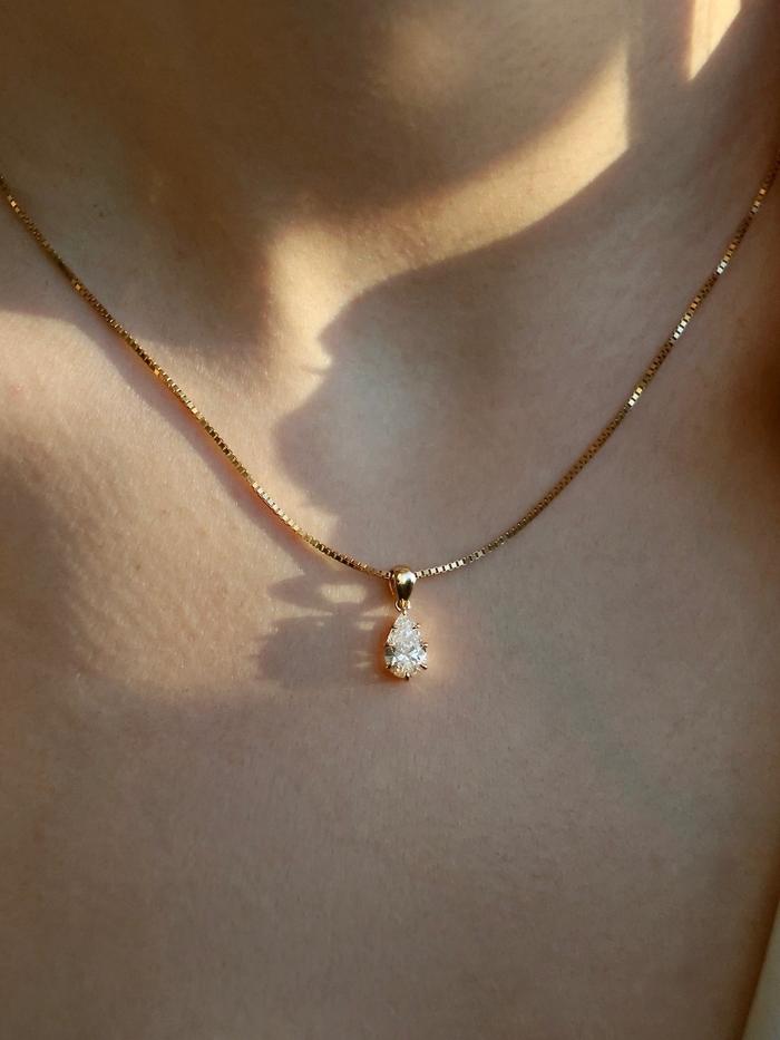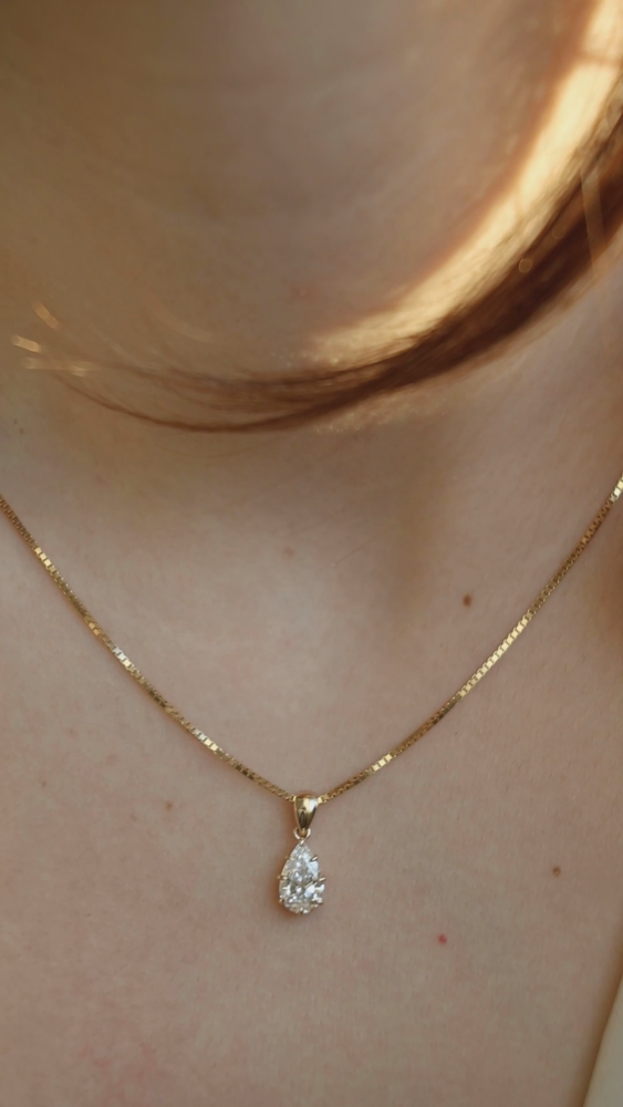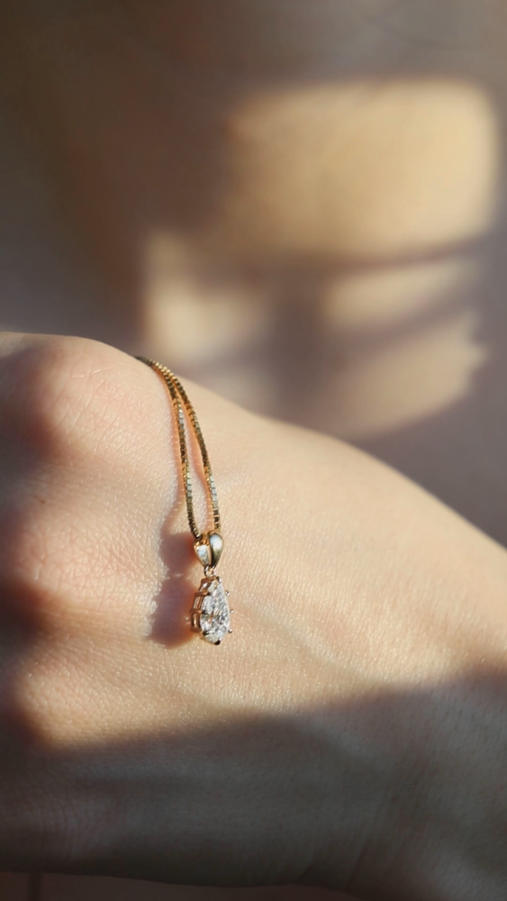 A teardrop-shaped connector in pure gold mirrors the diamonds silhouette, linking the pendant effortlessly to your chain. The thoughtful construction creates movement, while always holding the diamond in perfect alignment.