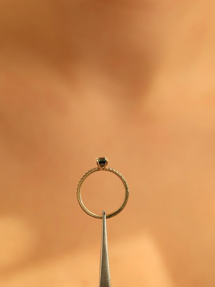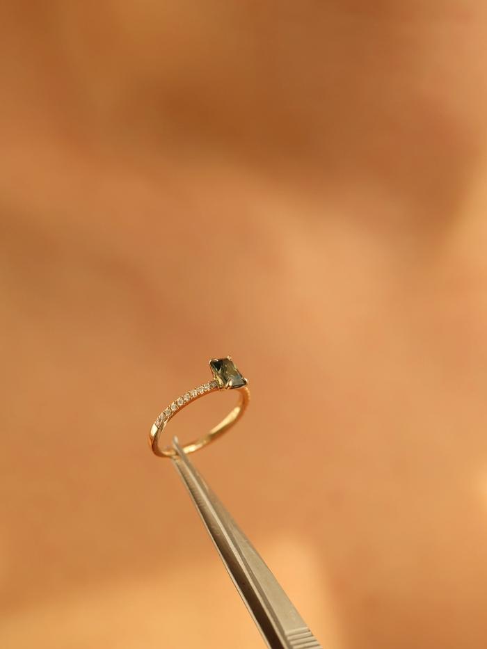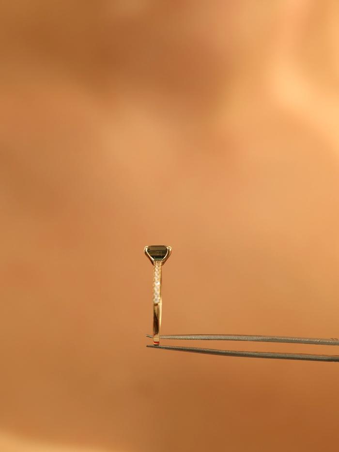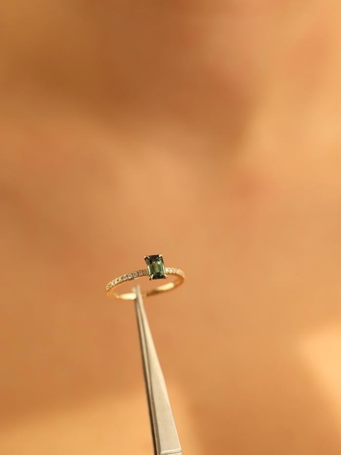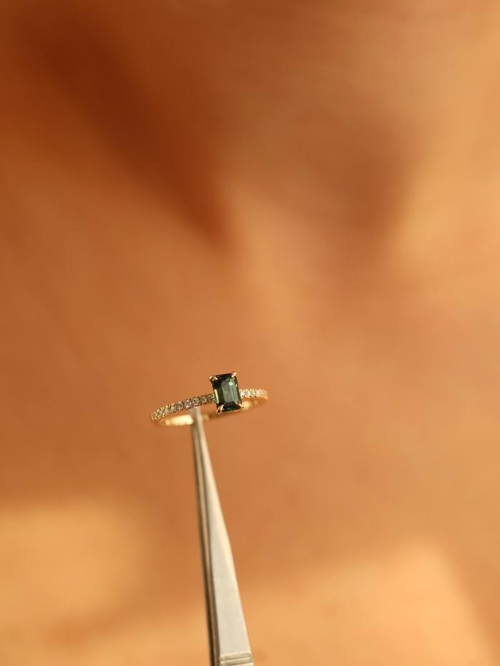 This ring is handcrafted in solid yellow gold and features a natural unheated sapphire of 1,04 carat in an emerald cut. The gemstone glows in deep green with teal and forest undertones – a color fusion reminiscent of hidden lagoons and peacock feathers shimmering in sunlight. With its excellent cut, the sapphire radiates brilliance through every clean facet, telling a story of depth and life.