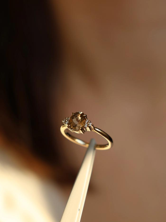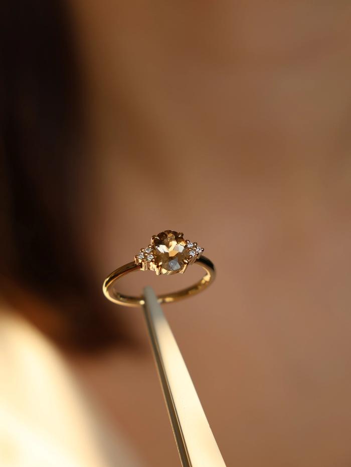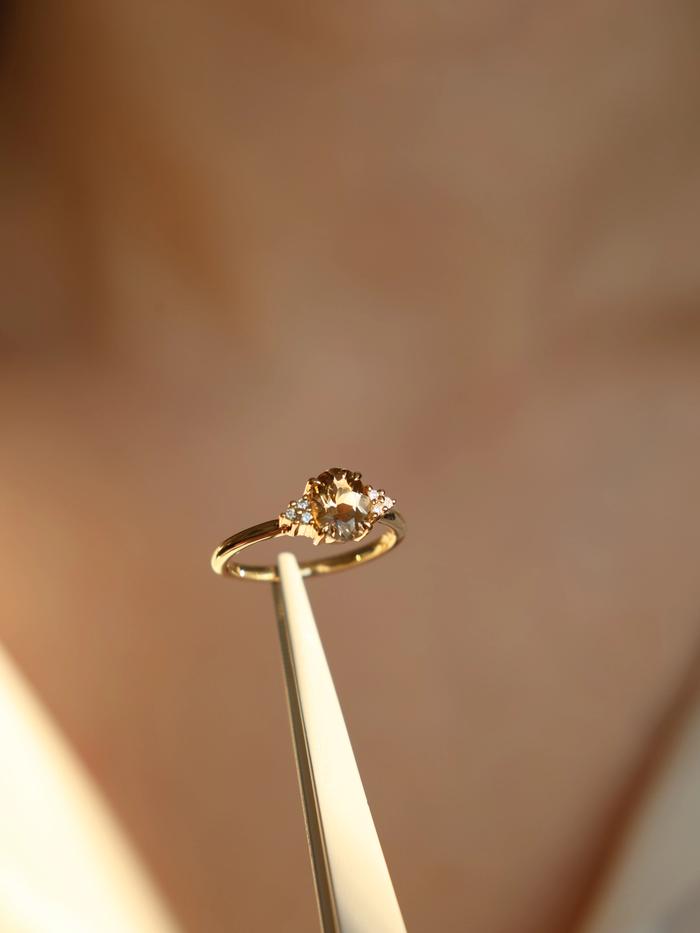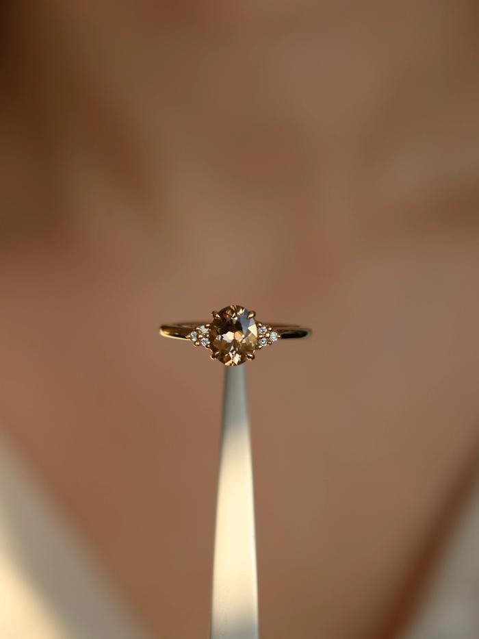 Like golden light caught at twilight, this ring glows with quiet intensity. At the center: a rare, one-of-a-kind natural champagne tourmaline — oval-cut and alive with honeyed warmth. Weighing 1,14 carat, the gemstone shifts gently between golden amber and soft cognac, creating a color that feels both vintage and modern.