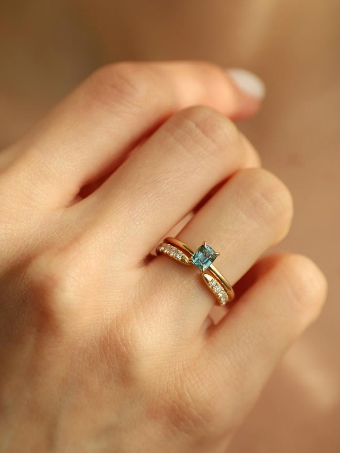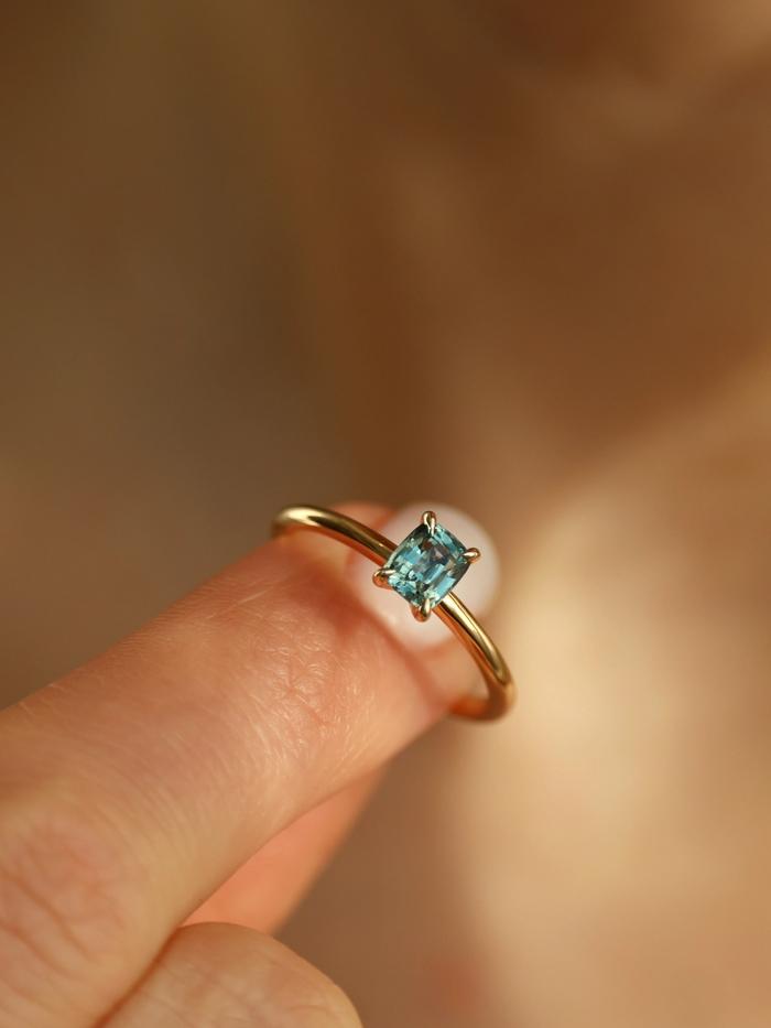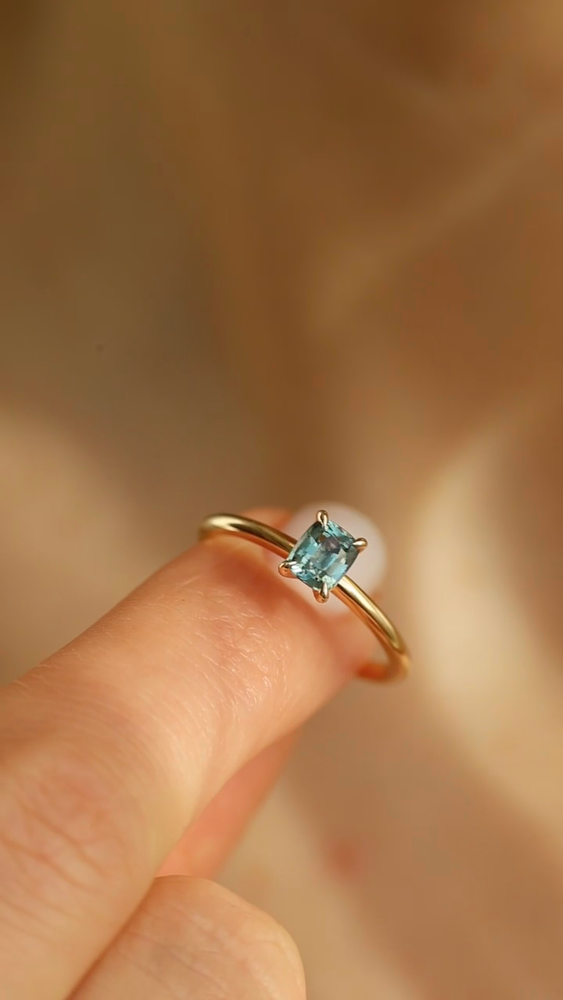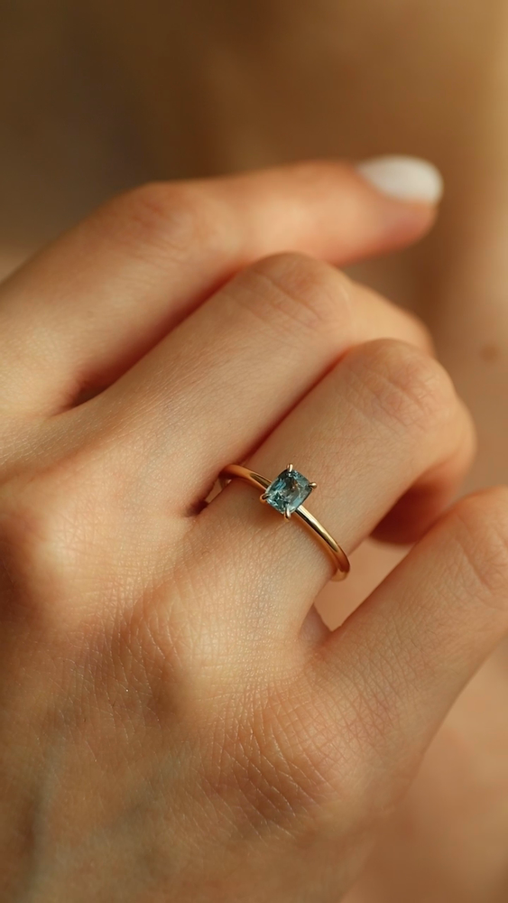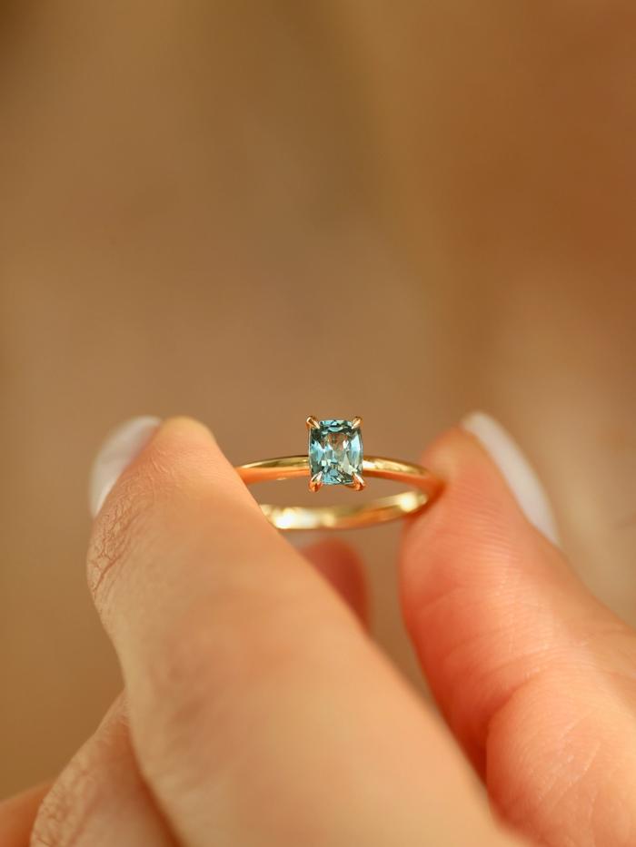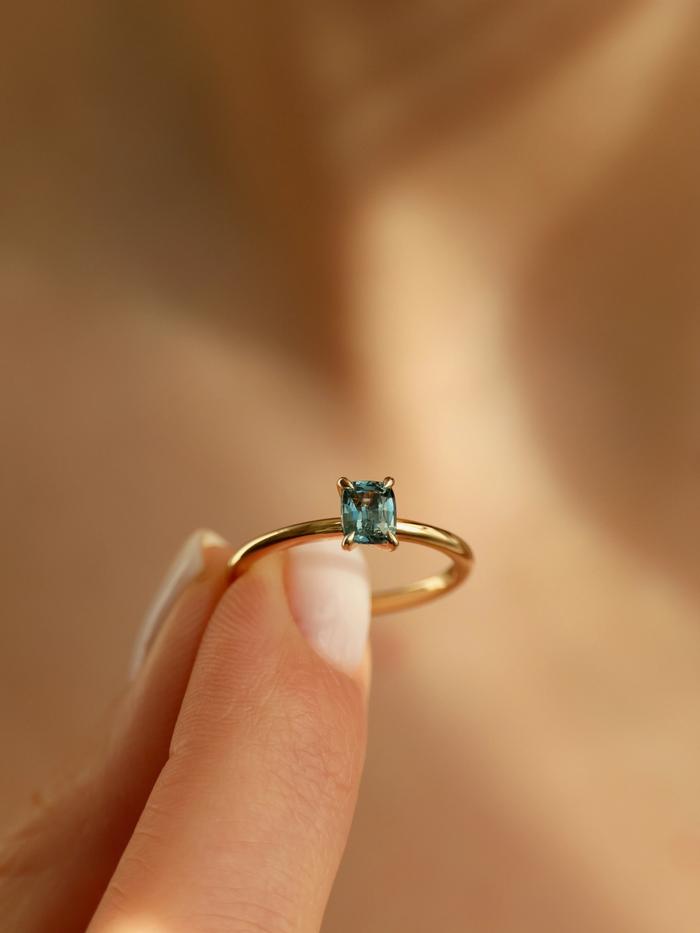 This ring is handcrafted in solid yellow gold and features a natural cushion-cut sapphire weighing 0,75 carat. The gemstone glows in a refined teal hue with subtle sea-blue and green undertones – like ocean mist at dawn, delicate yet endlessly captivating. It is tranquil, radiant, and full of depth.