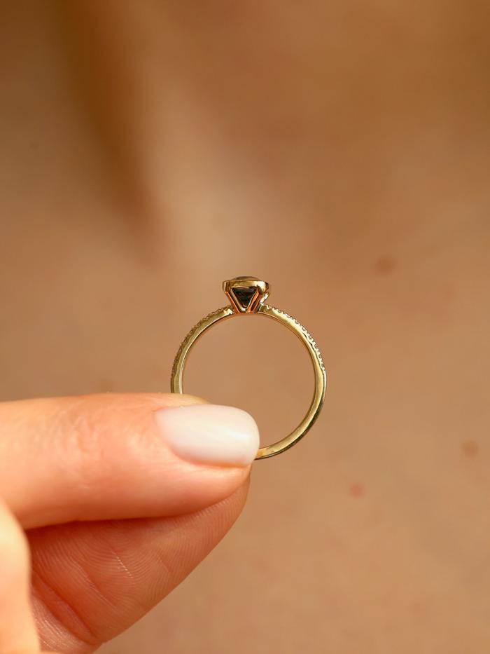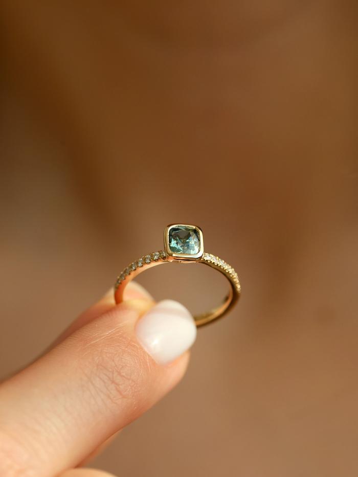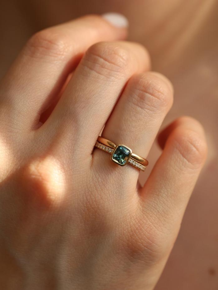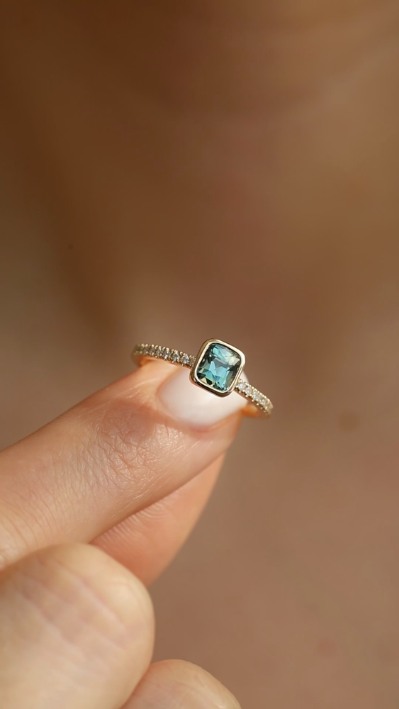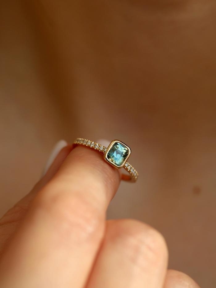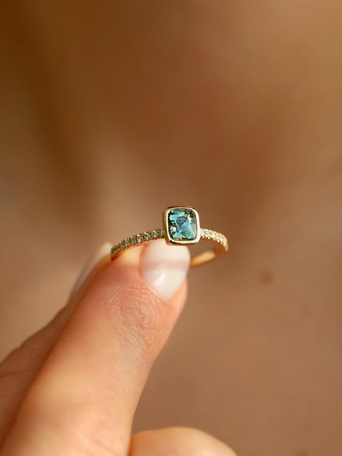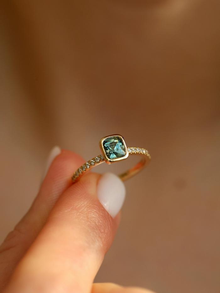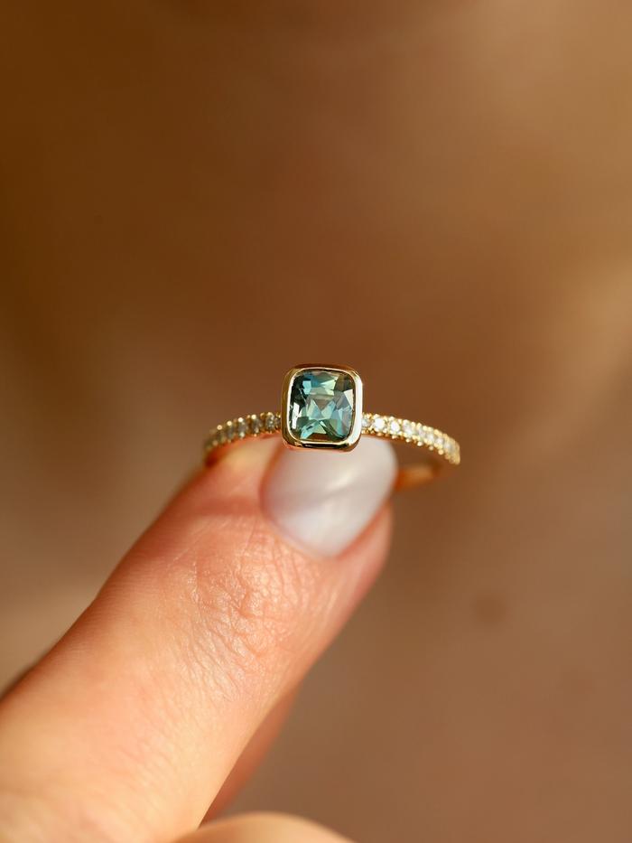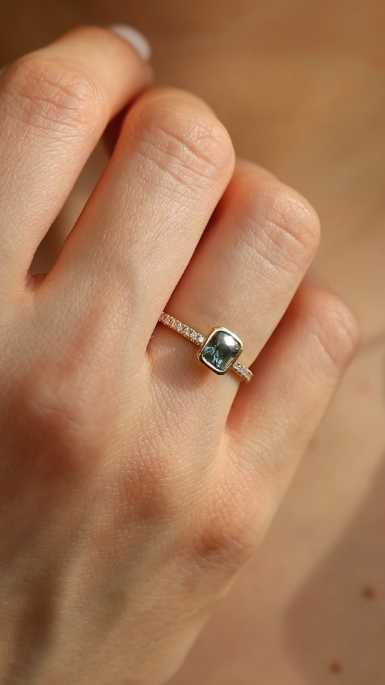 The gemstone is set in a low-profile bezel setting that follows the cushion shape, offering both a clean, modern aesthetic and everyday durability. The delicate pavé diamond band adds a soft shimmer, enhancing the sapphire’s natural depth while maintaining a balanced and understated elegance.