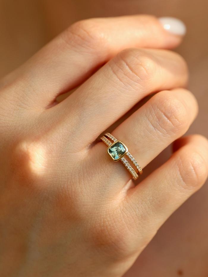 Where vibrant green tones meet refined modern design. The Verdant Peacock Cushion Sapphire Ring – Bezel features a 0.98 carat natural bi-colored sapphire, handcrafted in solid 14K yellow gold. The softly squared cushion sapphire reveals a lively interplay of green and yellow tones, where fresh verdant hues meet subtle golden undertones that shift gently as light moves across the gemstone.